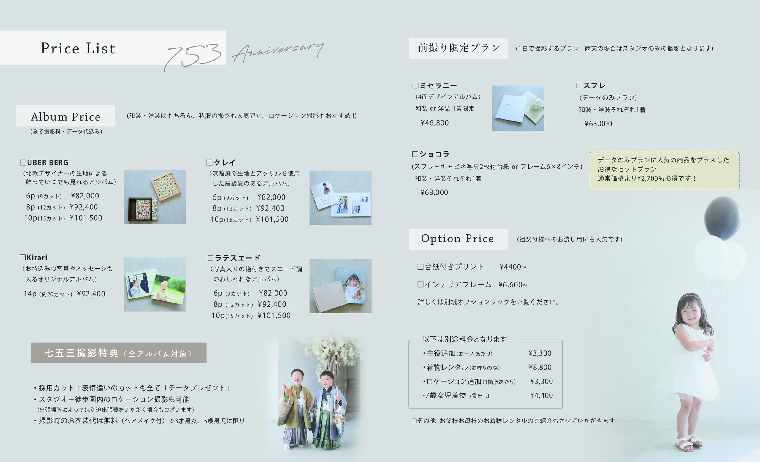 お子様らしい自然な表情を引き出します。たくさん遊びながら多カット撮影させていただきます。仕上がり写真のイメージをお持ちでしたら、それに近い写真になるよう対応させて頂きます。スタジオ内はもちろん、松江市内へロケーション撮影に出かける事も可能です。